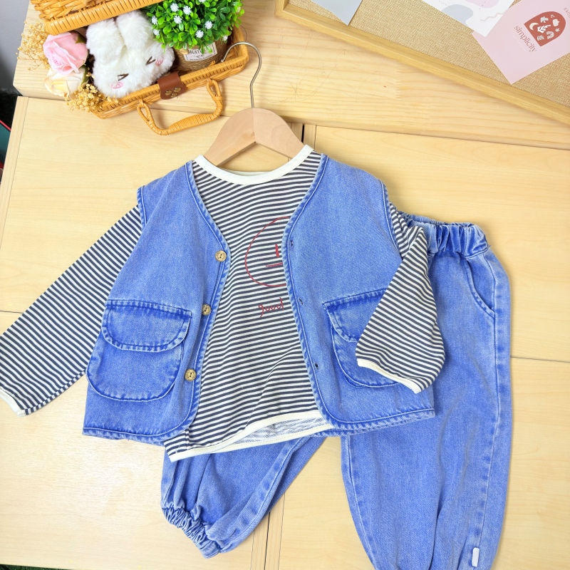 Made of high-quality denim fabricSoft and breathable material for all-day comfortStylish three-piece set: jacket, top, and pantsClassic button-up jacket designElastic waistband for a comfortable fitAvailable in size 73-100cm
